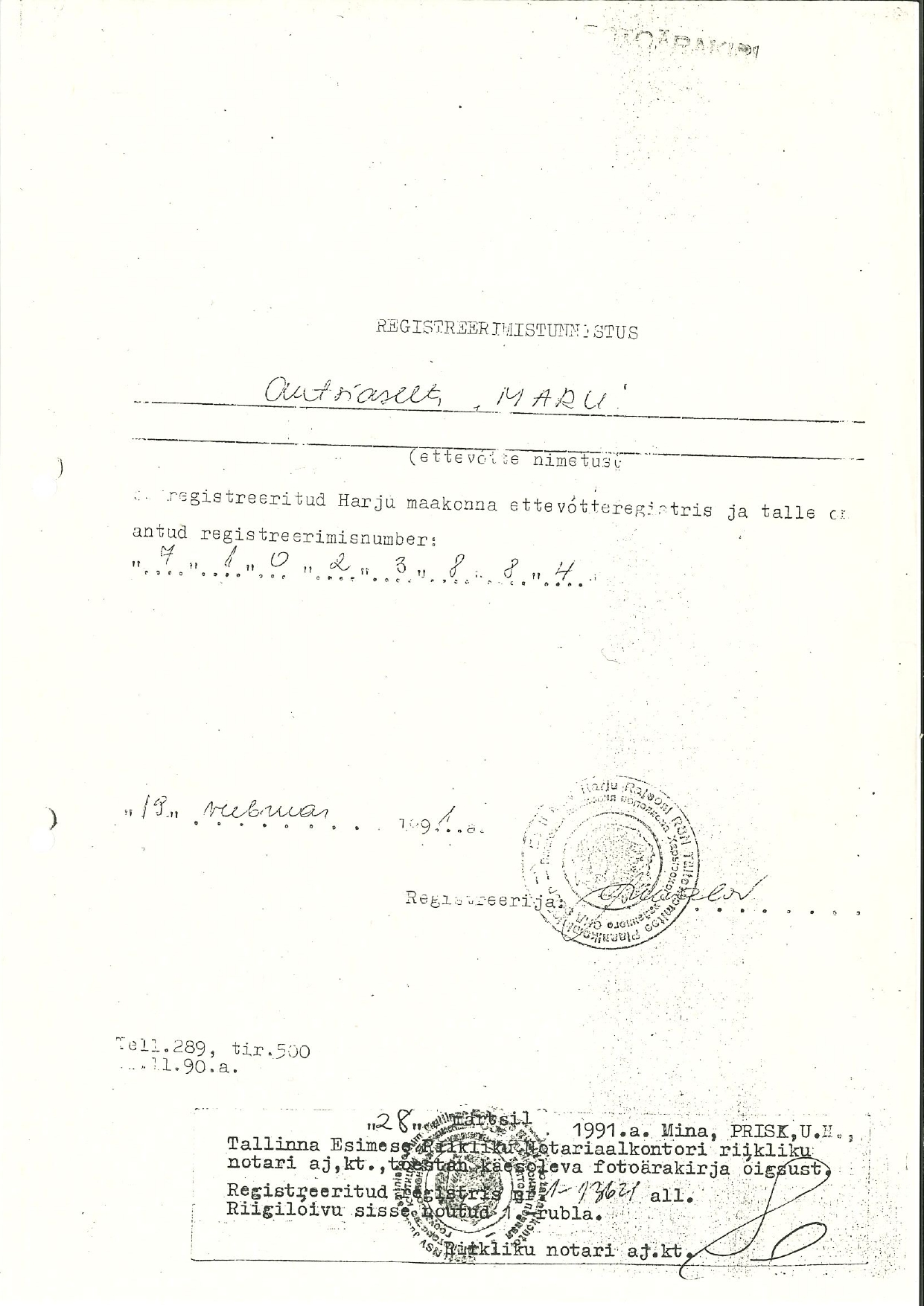 Maru registreerimistunnistus ja tegutsemisluba aastast 1991