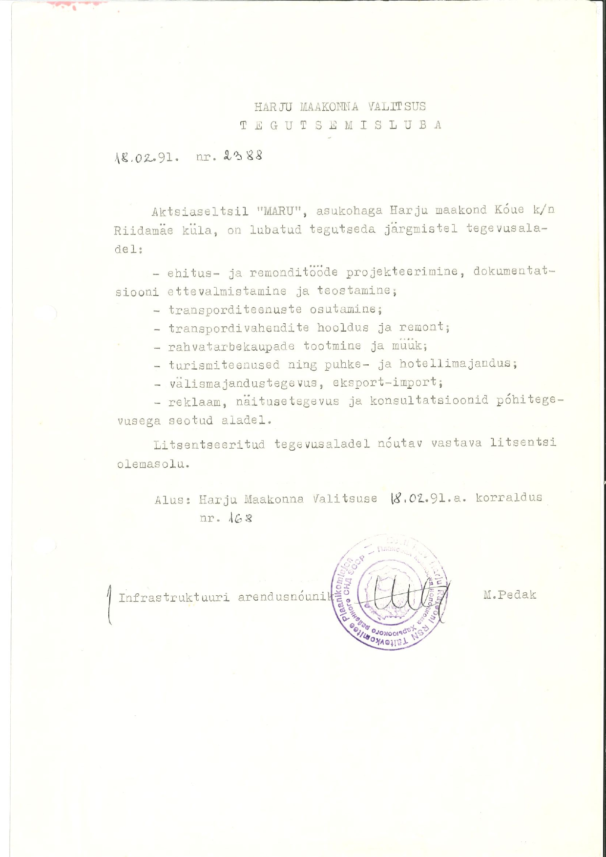 Päev varem oli Harju maakonna valitsus andnud toona Kõue vallas Riidamäe külas tegutsevale Marule tegevusloa, mis andis vastsele ettevõttele loa tegeleda „ehitus- ja remonditööde projekteerimise, dokumentatsiooni ettevalmistamise ja teostamisega“, aga ka muuhulgas „rahvatarbekaupade tootmise ja müügi“ ning „välismajandustegevusega“ (vt uudise all pilti).